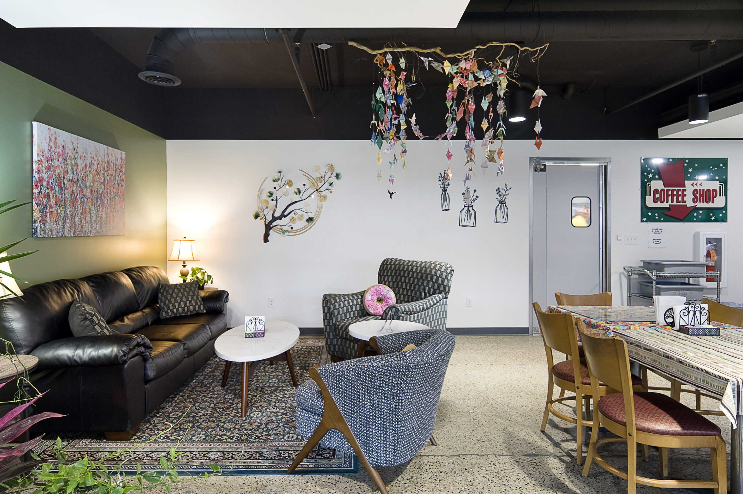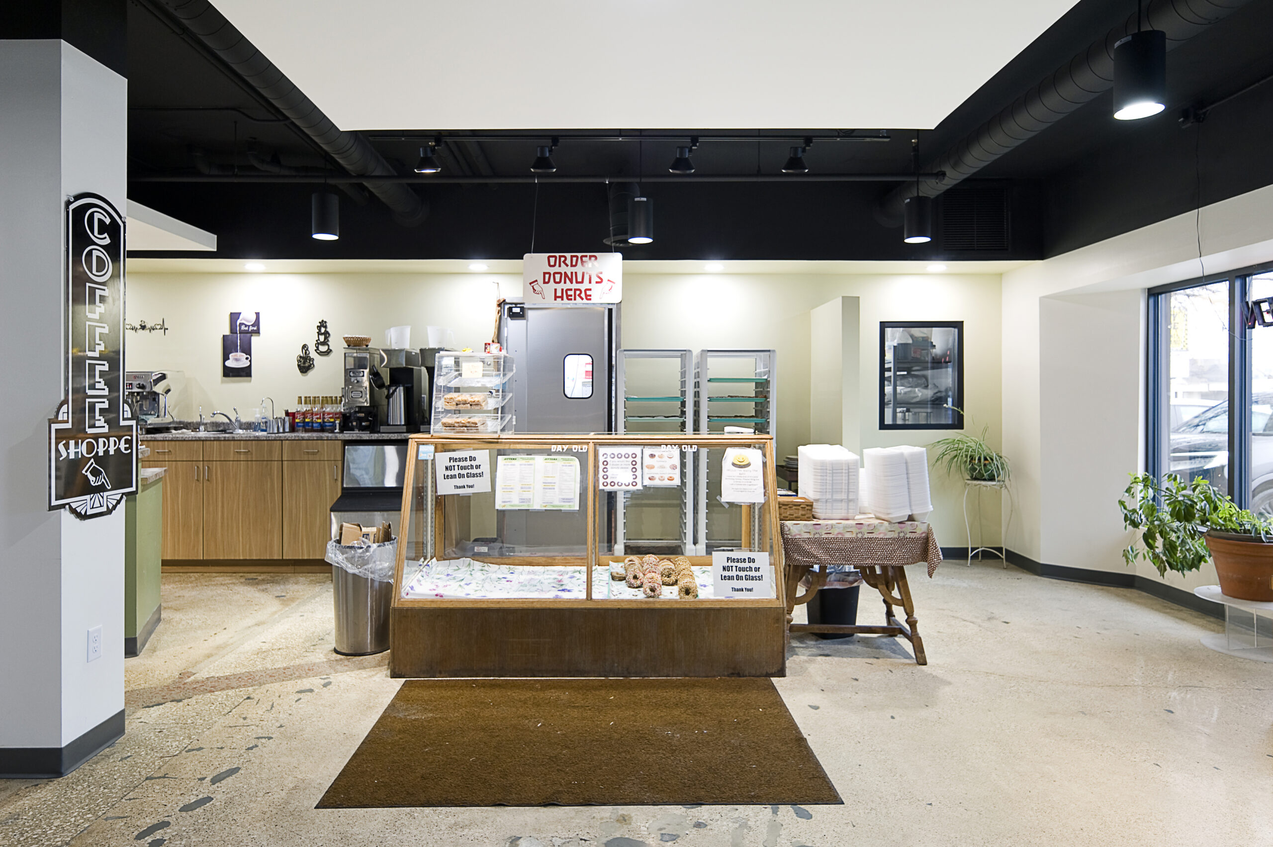Jitters Tenant Infill is the new space for Jitters Coffee and Donuts located in the Floyd River Flats commercial space (formerly part of Ramada Inn). This space was previously the kitchen and part of the lobby for the Ramada Inn before it was transitioned into apartments and is now known as Floyd River Flats. Jitters Coffee and Donuts is a Sioux City locally owned small business that was established in 1999; they were seeking a larger space, specifically a larger kitchen as they had outgrown their previous kitchen. Jitters consists of a large indoor seating area to enjoy freshly made coffee, donuts, and a lunch menu while creating a cozy atmosphere amongst the hustle and bustle of Nebraska Street to the west. Smaller outdoor seating sits amongst the Floyd River Flats courtyard for a more tranquil atmosphere to the east. Unique design elements include strategically placed ceiling clouds, a viewing window into the kitchen for patrons to watch the donuts being made, a full renovation of the old kitchen, added storage, and an entire overhaul of the mechanical, electrical, and plumbing systems in order to support the new kitchen elements. A new and more functional point of sale counter was created with a much larger counter behind the point of sale counter to improve service the patrons as well as a revamped programmatic layout to enhance employee workflow throughout the space.
