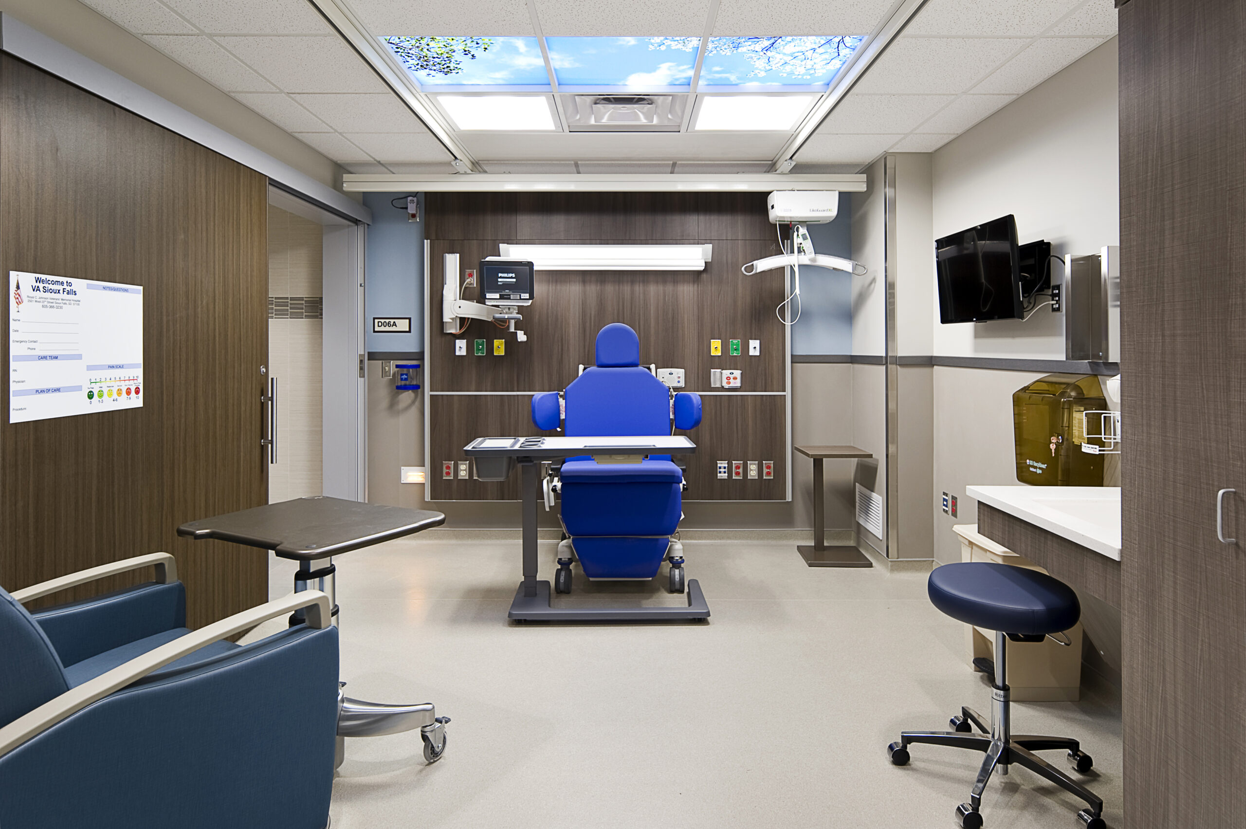 The Sioux Falls VA Preoperative Care Unit is a renovation project within the Surgery/Specialty Care Service Line at the Royal C. Johnson Veterans’ Memorial Hospital. Previously a lab, the PreOp Unit was thoughtfully designed to prepare Veterans for surgical procedures while ensuring comprehensive, patient-centered care. The renovation includes 13 beds, three exam rooms and supporting staff spaces. Completed in 2025, it was essential that the project coordinated with other building projects to ensure there were no project overlaps in addition to maintaining proper function of hospital services during construction.